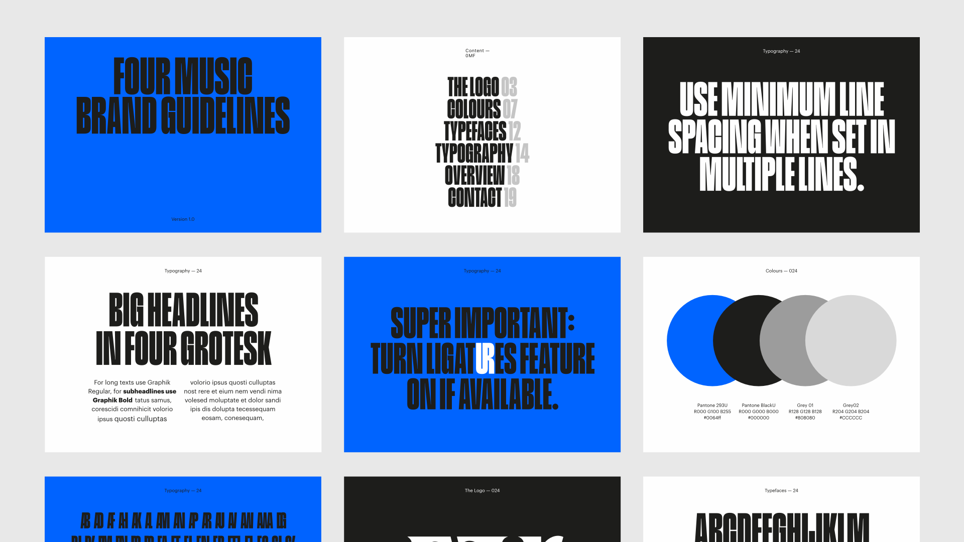 The new custom font pays homage to Four Music’s origins in German hip hop. Drawing inspiration from Haettenschweiler (1954) and Compacta (1963), it transforms the formal language of both into a contemporary tone. With horizontal terminals and distinctive sharp details, Four Grotesk confidently delivers impactful statements in headlines.
